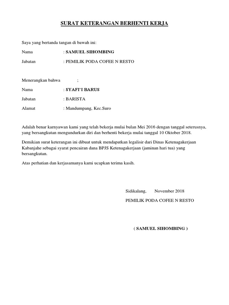 Haaasebab nak muda Contoh Surat Berhenti Kerja Barista Image Result For Contoh Surat Berhenti Kerja. AHMAD FARHAN BIN AHMAD FUAD. Semoga contoh surat berhenti kerja ini tidak menjadi motivasi anda untuk mengundurkan diri dan menjadi tambahan ilmu bagi anda untuk membantu baik anda teman maupun saudara.